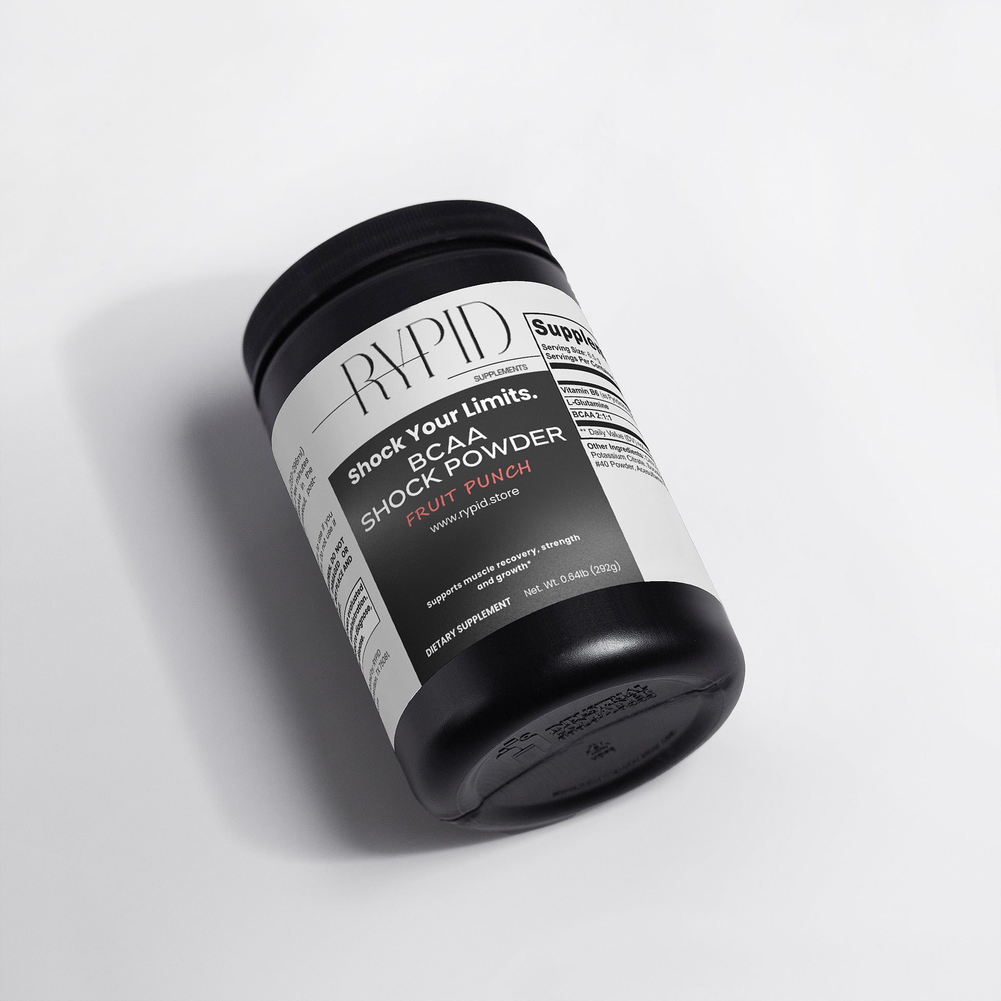 Ingredients: Vitamin B6 (as Pyridoxine Hydrochloride), L-Glutamine, BCAA 2:1:1, Citric Acid, Fruit Punch flavor, Potassium Citrate, Silicon Dioxide, Sucralose, Sodium Chloride, Acesulfame Potassium, FD&C Red #40 Powder.